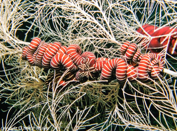 Red and white striped Snakestar on Black Coral tree