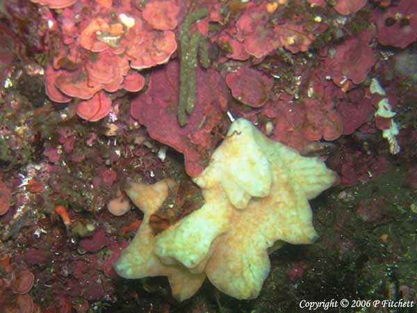 Unknown white sponge and nemertean or ribbonworm (brown, top center), with red coralline algae