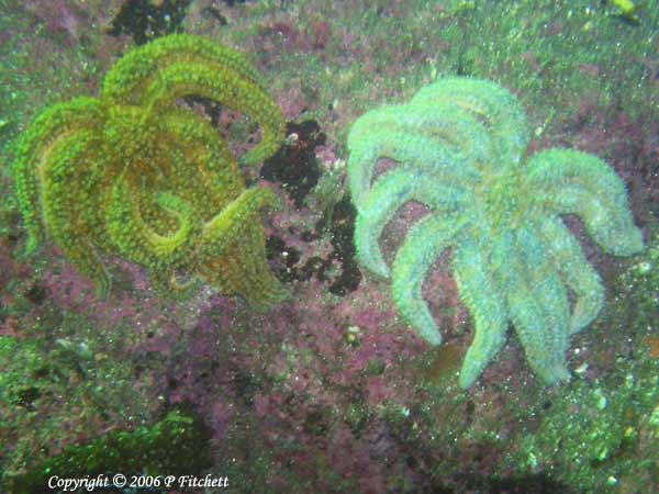 Eleven-arm starfish (right) with 9 arm starfish (left)
